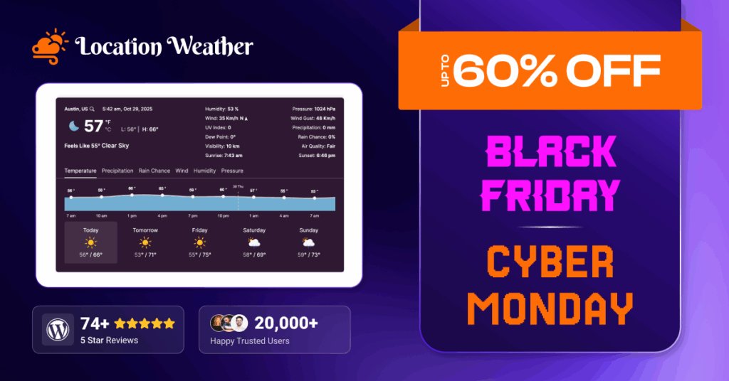 #1 WordPress weather widget plugin with 15 interactive Gutenberg blocks. Display real-time weather forecasts for daily and hourly in modern accordions, tables, layouts—a must-have plugin for every weather-dependent business.