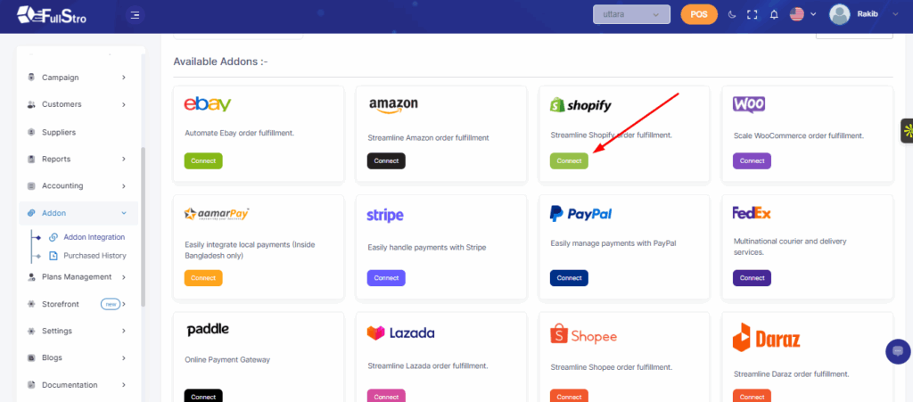 FullStro allows you to purchase and connect addons to enhance your store. Follow these steps: