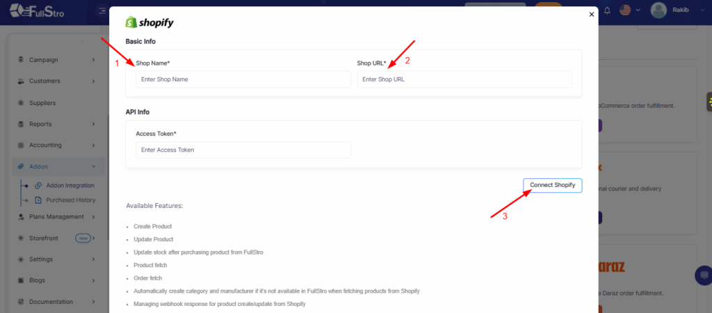 Enter your Shop Name and Shop URL, then click Connect Shopify to link your store with the addon.
