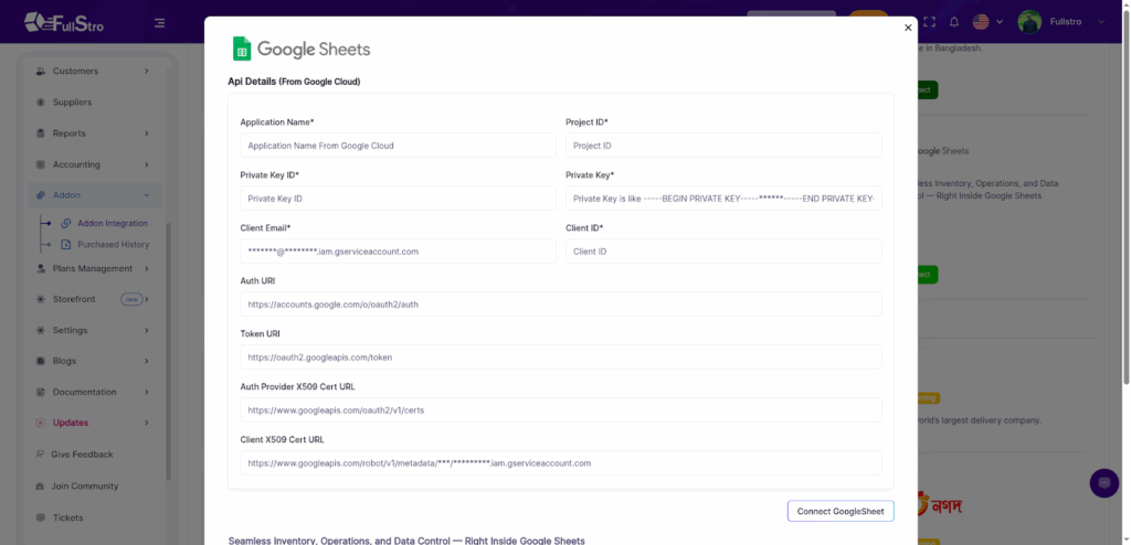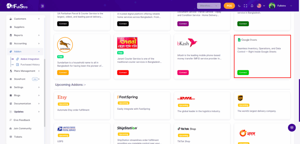First, log in to your FullStro account. From the right panel, click on Addon > Addon Integration in the left panel. You’ll now see the Addon Integration Dashboard displaying all available integrations. Find and click on the Google Sheet Connect button.