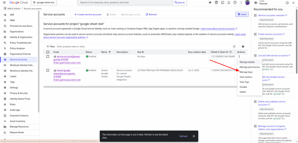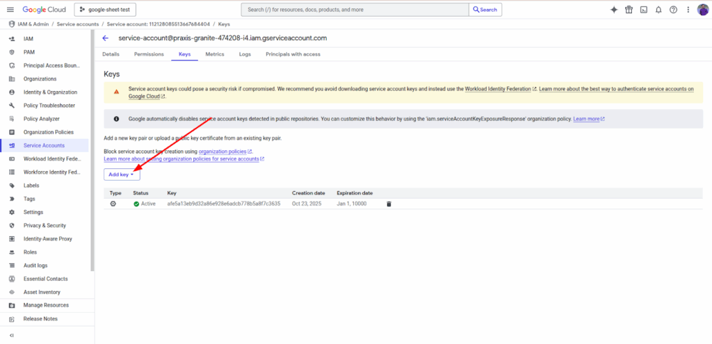10. Click on Keys → Add Key → Create new key. Choose JSON and click Create. A file will automatically download to your computer. This is your Service Account JSON File — keep it safe!