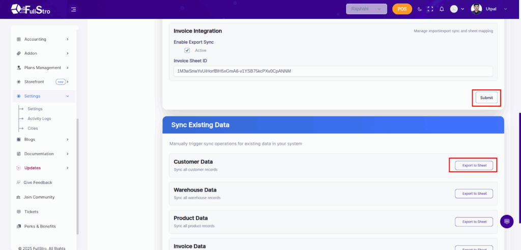 13. After submitting sheet IDs and making them active, you can find the export sheet button, and you can export to your Google Sheet.