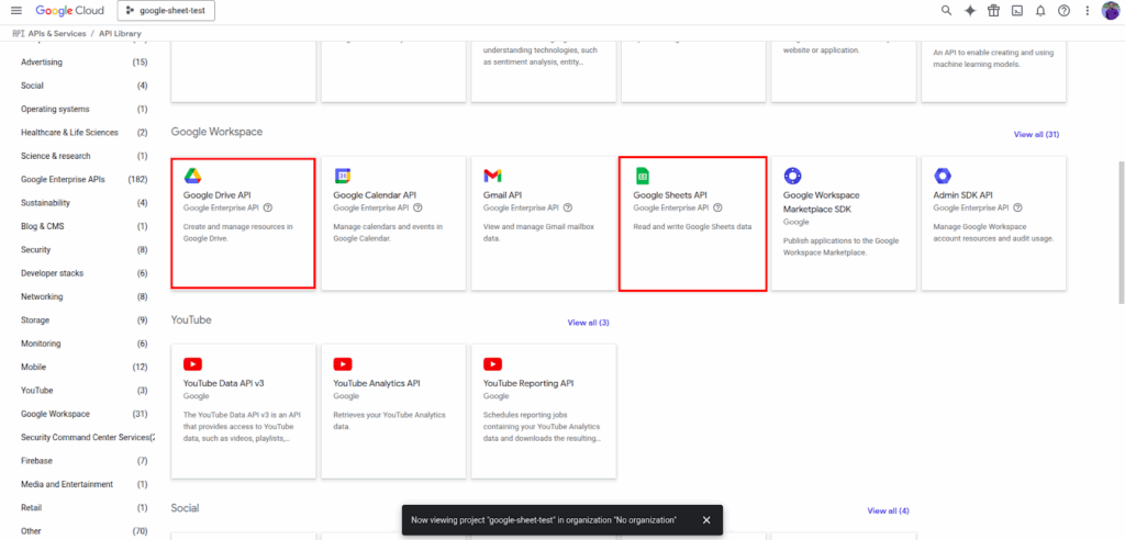Before connecting, you need to enable the Google Sheets and Drive APIs.