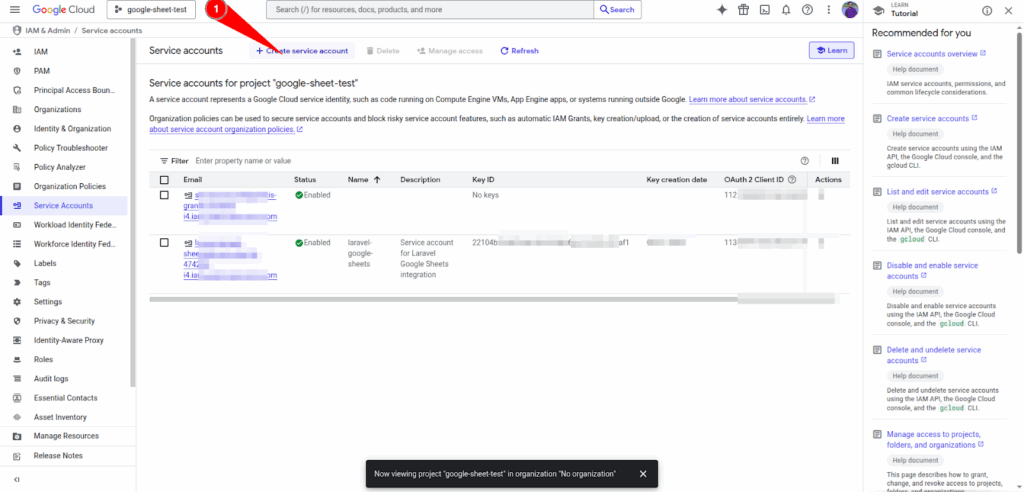 7. Now, let’s create a Service Account to securely connect FullStro with your Google account. Go to APIs & Services > Credentials (or IAM & Admin > Service Accounts) in your Google Cloud Console.