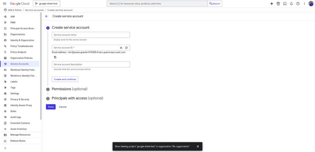 8. Click Create Credentials → Service Account. Give it a name (for example: “FullStro Integration”) and click Create and Continue. Skip role assignment if you prefer minimal permissions, then click Done. Your new service account is now created.