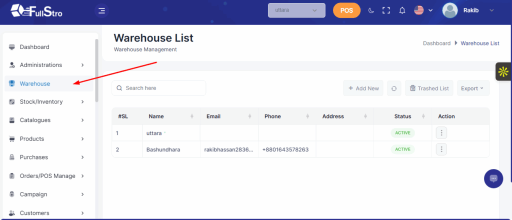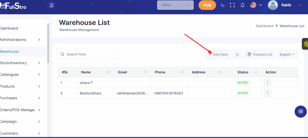 FullStro allows you to manage your warehouses efficiently. Follow these steps to add a new warehouse: